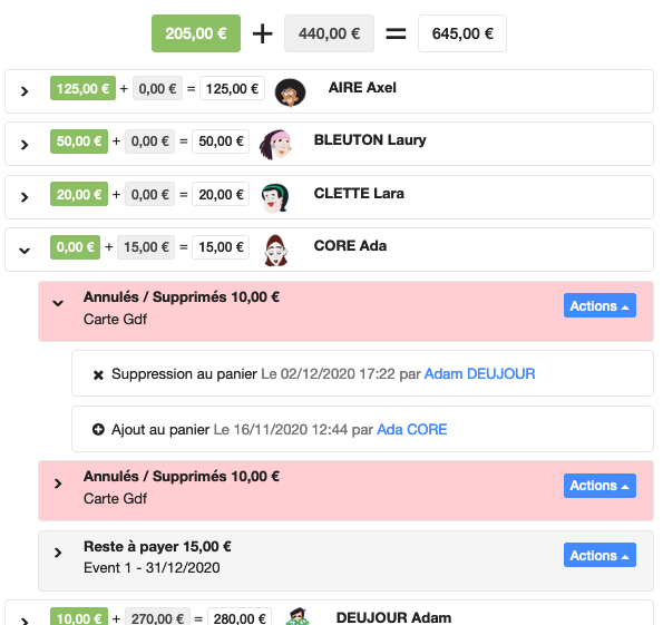 Ecran de trésorerie avec filtres par membre ou par évènement pour connaître soldes